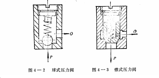 直動(dòng)式溢流閥的工作原理如圖4-1所示,就溢流閥閥芯結(jié)構(gòu)形式而言,圖4-1是滑閥式直動(dòng)壓力閥。除此而外常見(jiàn)的還有球閥式和錐閥式,如圖1-2和圖4-3所示,它們統(tǒng)稱為閥座式壓力閥。在油壓小于彈簧力時(shí),球形閥芯和錐形閥芯在彈簧力作用下緊緊壓在閥座上,密封性較好,閥芯和閥套之間沒(méi)有如同滑閥式壓力閥具有一定油封長(zhǎng)度而產(chǎn)生的動(dòng)作死區(qū)。只要油壓力超過(guò)彈簧力,閥芯立即開(kāi)啟,靈敏性很高,壓力超調(diào)量小,所以在導(dǎo)控式溢流閥巾,不論導(dǎo)閥和主閥普遍采用錐閥結(jié)構(gòu)。但因直動(dòng)式球閥和錐閥式壓力閥在大流最時(shí)易發(fā)生振動(dòng)和噪音,閥芯易和閥座發(fā)生撞擊,壽命短,故一般多作為安全閥使用。
