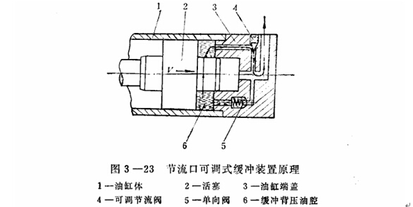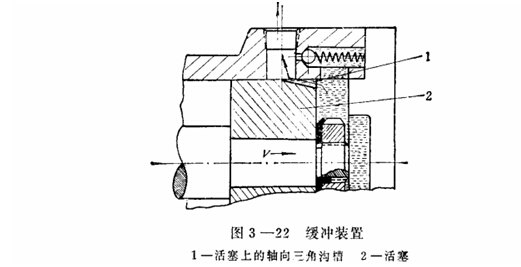 圖3-22是活塞頭部帶有軸向三角節(jié)流溝梢的緩沖裝置。當(dāng)活塞運(yùn)動(dòng)到接近終點(diǎn)時(shí)將回油路封閉,油缸中剩下的油液只能通過(guò)三角狗槽流出,形成液壓阻力;钊酵耙疲枇υ酱,直至移動(dòng)部件停止運(yùn)動(dòng)。也有在油缸端部加可調(diào)節(jié)流間,使油缸中被封閉的油液經(jīng)可調(diào)節(jié)流閥口流出,這樣便可按負(fù)載慣性力大小適當(dāng)調(diào)節(jié)緩沖背壓,其工作原理示于圖3-23。