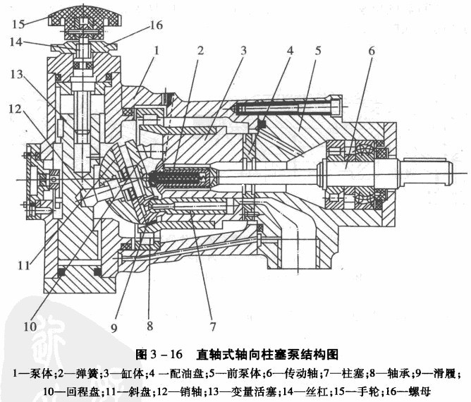 1)典型結(jié)構(gòu)。圖3 -16為液壓機(jī)一直軸式軸向杜塞泵的結(jié)構(gòu)圖。官由斜盤11、柱塞7、缸體3、配油盤4、傳動軸6等組成。柱塞的球狀頭部裝在滑履9內(nèi),以缸體為支撐的彈簧2通過鋼球推壓回程盤10,回程盤和柱塞滑履一同轉(zhuǎn)動。在排液過程中借助斜盤11推動柱塞作軸向運動;在吸油時依靠回程盤、鋼球和彈簧組成的回程裝置將滑履緊緊壓在斜盤表面上滑動,彈簧2一般稱為回程彈簧,這樣的泵具有自吸能力。在液壓機(jī)滑履與斜盤相接觸的部分有一油室,它通過柱塞中間的小孔與缸體中的工作腔相連,壓力油進(jìn)入油室后在滑履與斜盤的接觸面間形成了一層油膜,起著低壓支撐作用,使滑履作用在斜盤上的力大大減小,因而磨損也較小。傳動軸6通過左邊的花鍵帶動缸體3旋轉(zhuǎn),由于滑履9貼緊在斜盤表面上,柱塞在隨缸體旋轉(zhuǎn)的同時在缸體內(nèi)作往復(fù)運動。缸體中柱塞底部的密封工作容積是通過配油盤4與泵的進(jìn)出口相通的。隨著傳動軸的轉(zhuǎn)動,液壓泵連續(xù)地吸油和排袖向移動(因?qū)蜴I的作用,變量活塞只能作軸向移動,不能轉(zhuǎn)動)。通過銷軸12使斜盤11繞變量機(jī)構(gòu)殼體上的圓弧導(dǎo)軌面的中心(即為鋼球中心)旋轉(zhuǎn),從而使外盤傾角改變,達(dá)到變量的目的。當(dāng)流量達(dá)到要求時,可用鎖緊螺母16鎖緊,這種變量機(jī)構(gòu)結(jié)構(gòu)簡單,但操縱較復(fù)雜,且不能在工作過程中變量。