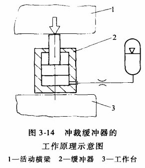 圖3-14為一沖裁緩沖器的工作原理示意圖。緩沖器安放在工作臺上,在材料被沖斷之前緩沖器開始起作用,在活動橫梁的驅(qū)動下,緩沖活塞向下運動將液體排過節(jié)流口,由于此時液壓機速度很低,液體流過節(jié)流口時只產(chǎn)生很小的壓力降,不會對活動橫梁產(chǎn)生大的阻力,在材料被沖斷的瞬間,活動橫梁以很大的加速度下沖,迫使緩沖器內(nèi)活塞下的液體以很高的速度流過節(jié)流口,在節(jié)流口兩端產(chǎn)生很大的壓力差,從而使緩沖器內(nèi)活塞下的液體壓力急劇上升,產(chǎn)生一很大的反力,阻止活動橫梁下沖以達到減緩彈性能釋放、緩沖振動的目的。