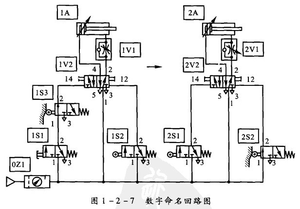 IA、2A等代表執(zhí)行元件. 1 VI、1 V2等代表控制元件. 1 S I、IS2等代表輸入元件(孚動 和機控間). OZI、OZ2等代表能源供給(氣源系統(tǒng))。