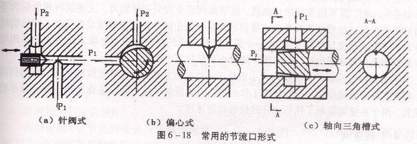圖6 -18是常用的三種節(jié)流口形式。圖6 -18(a)為針閥式節(jié)流口,針閥做軸向移動,政主通流面積,以調(diào)節(jié)流量,其結(jié)構(gòu)簡單,但流量穩(wěn)定性差,一般用于要求不高的場合。圖6-8(b)為偏心式節(jié)流口,閥芯上開有截面為三角形或矩形的偏心槽,轉(zhuǎn)動閥芯就可改變通流亙積以調(diào)節(jié)流量,其閥芯受徑向不平衡力,適用于壓力較低的場合。圖6-18(c)為軸向三角噎式節(jié)流口,閥芯端部開有一個或兩個斜三角槽,在軸向移動時,閥芯就可改變通流面積的小,其結(jié)構(gòu)簡單,可獲得較小的穩(wěn)定流量,應用較廣泛。
